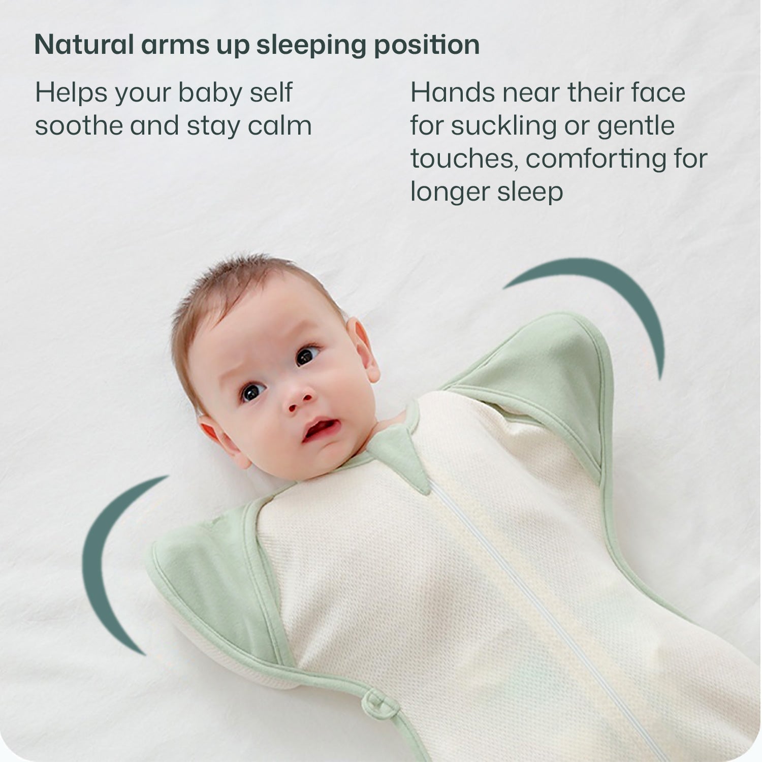 Arms-up lets baby self-soothe through the fabric